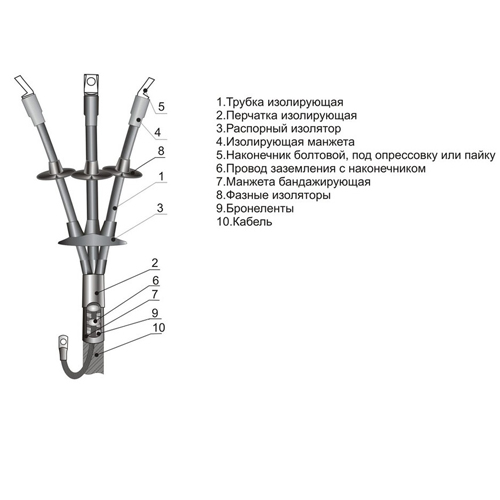 На разделанные жилы кабеля поверх жильной изоляции усаживаются изолирующие трубки (1). Корешок разделки герметизируется изолирующей перчаткой с внутренним клеевым подслоем (2). На жилы кабеля устанавливаются наконечники с контактными срывными винтами (4) или оконцевание осуществляется другим способом (опрессовкой, пайкой) по желанию заказчика. Наконечники изолируются манжетами с клеевым подслоем (3). Соединение проводника заземления (8) с броней и оболочкой кабеля осуществляется самым надежным способом - пайкой (10). Узел заземления изолируется термоусаживаемой манжетой с клеевым подслоем (7). Для защиты корешка разделки от разрыва устанавливают термоусаживаемый распорный изолятор (9). Муфты комплектуются фазными изоляторами (по одному на каждую жилу) (6).